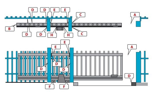 The opposing images show a plan and elevation view of a cantilever / sliding gate. Areas A to H show the areas where injury could potentially be caused. The bullet points A to H describe these hazards and the type of measures needed to control the risk from each hazard.