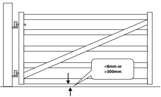 - hazards associated with the gates being activated automatically, or by another person (for example, by a sensor / loop under the road surface activating a gate when a car drives over it, a remote button, a remote control pressed by a third party or a gate operated by dialling a mobile phone);